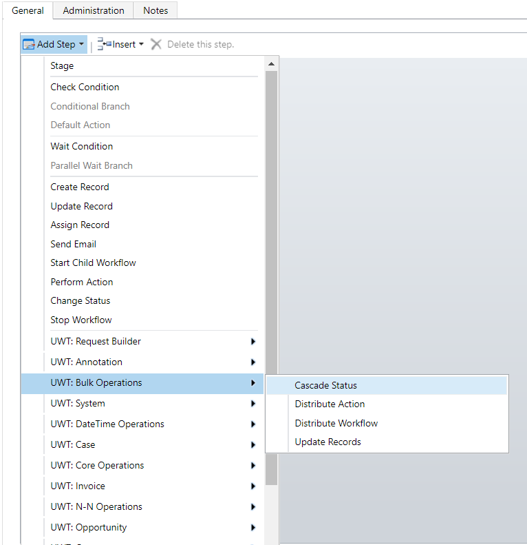 To use it add "UWT: Bulk Operations - Cascade Status" step to your workflow:
