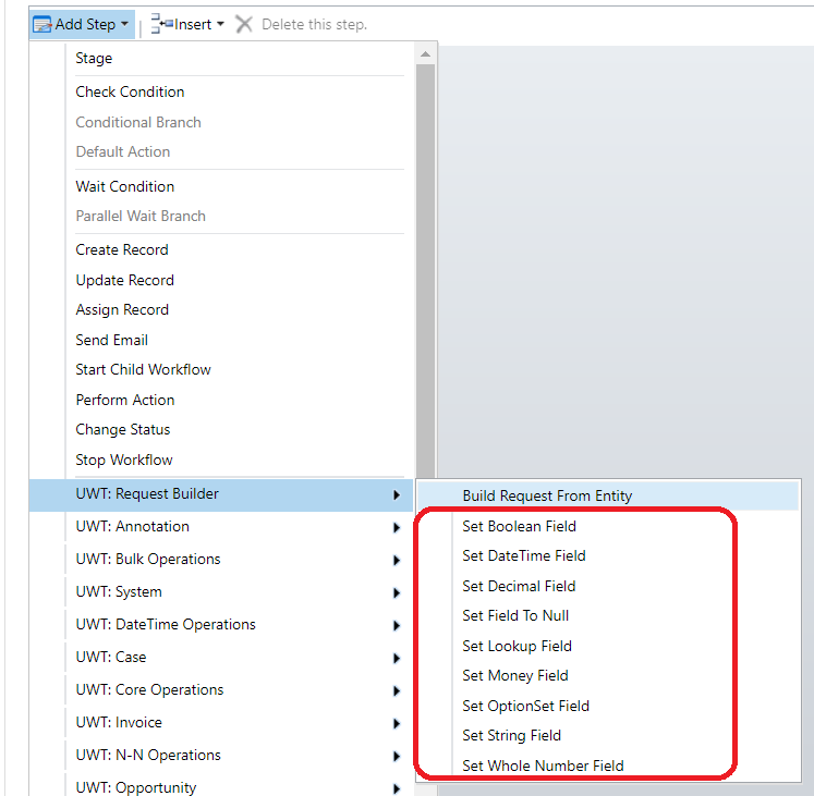 - Add one of "UWT: Request Builder - Set Field" to your workflow: