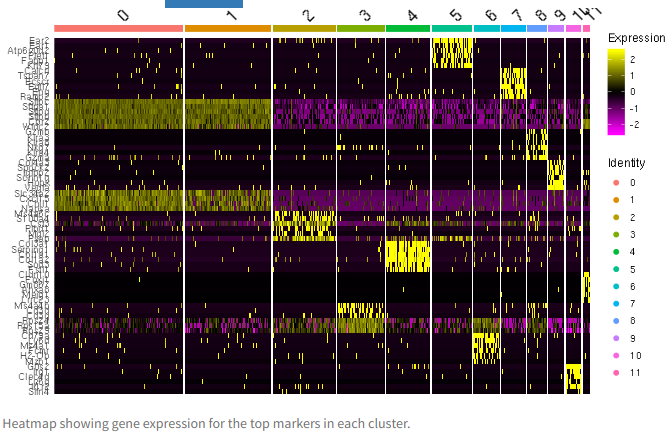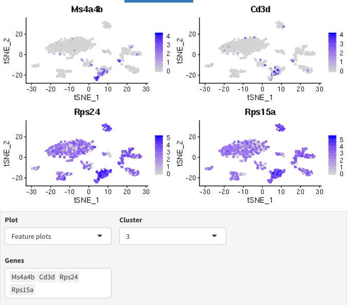There are three outputs for this section: A differential expression table, a gene expression heatmap and t-SNE cluster plots for marker visualization in clusters.