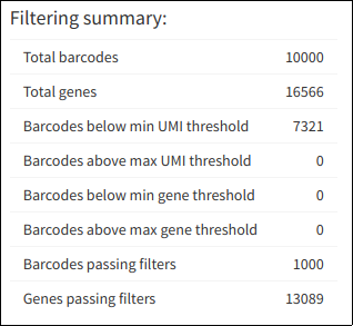A summary allows the user to track the filtering process, and see how many barcodes and genes passed through for further analysis.