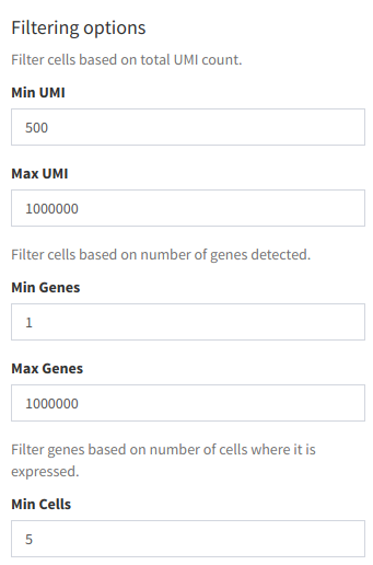 - Min UMI: Removes cells where the number of unique molecular identifiers (UMI) found is lower than the specified number.