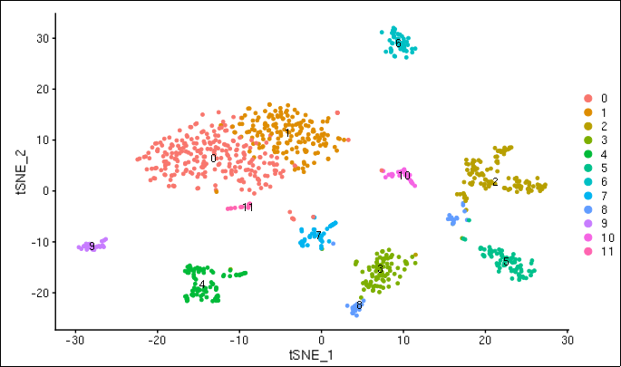 Dimensional reduction is performed using t-SNE, and is followed by a clustering analysis.