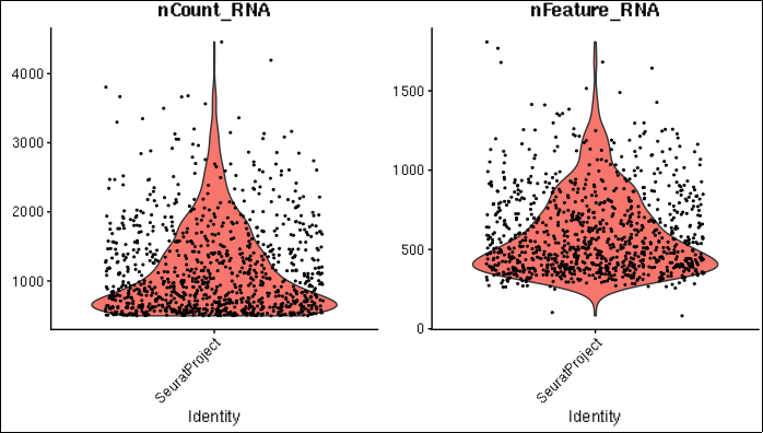 A set of violin plots shows the total distributions of total UMI per cell (left plot), and the number of detected genes per cell (right plot).