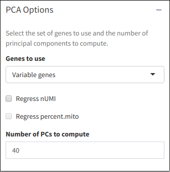 - Pattern for mitochondrial genes: Subsets mitochondrial genes based on a regular expression (e.g. ^mt- for mouse or ^MT- for human).