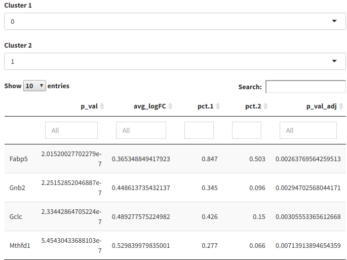 The differential expression table finds differentially expressed genes between clusters, and displays them in a tabular format.