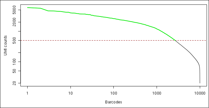 The barcode plot shows the total UMI per barcode, where the barcodes that were not filtered out and were selected for further analysis are displayed in the green line.