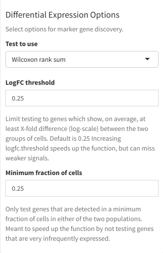 Marker gene discovery tests the various clusters generated in the clustering test to find markers. The available tests are the Wilcoxon rank sum, Student's t-test and Student's AUC classifier.