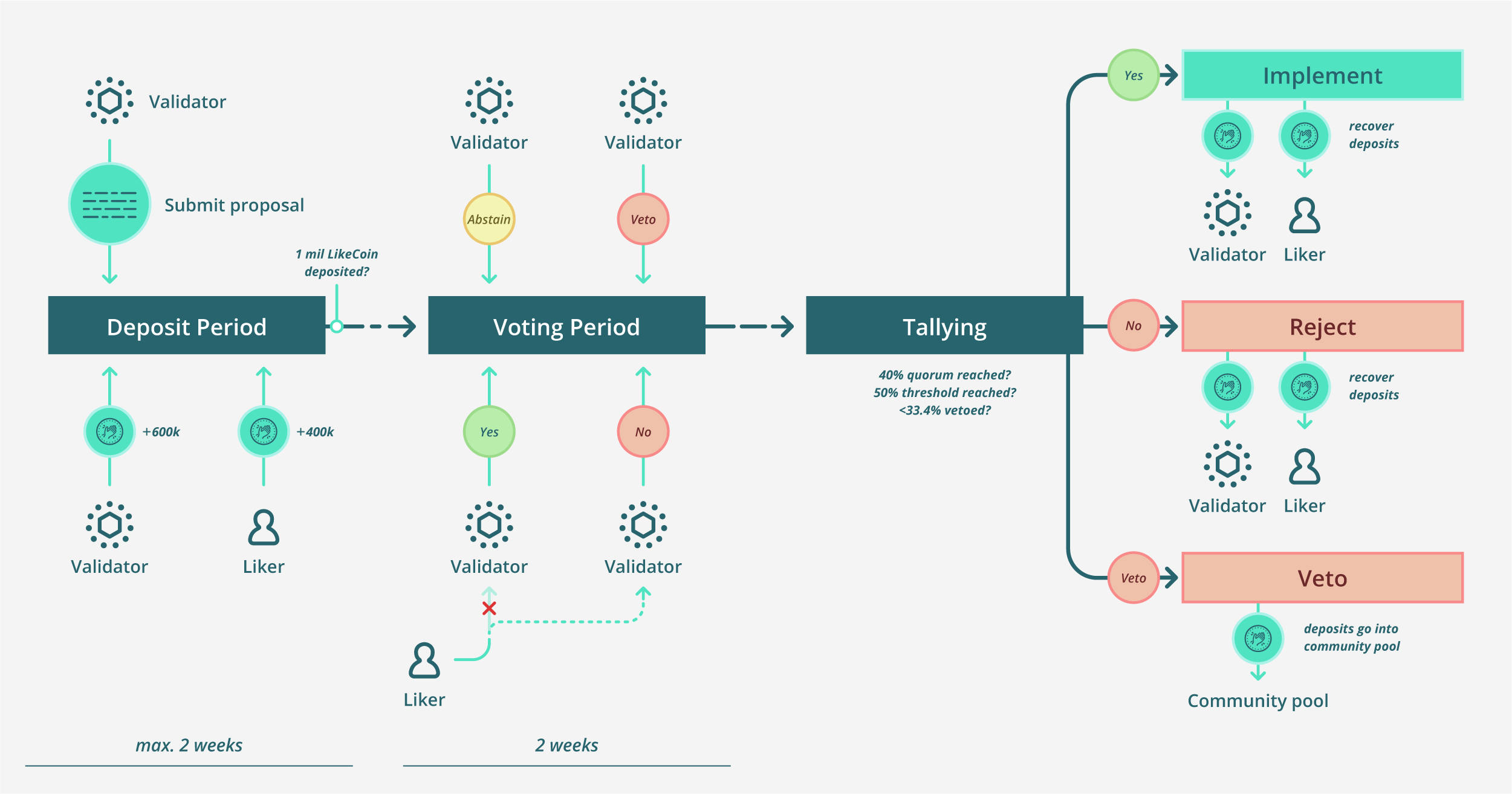 In order for a proposal to enter the voting period, 1mil LikeCoin has to be deposited within 2 weeks. Instead of having the validator who raised the proposal to deposit all 1mil LikeCoin, the deposit may come from other validators and Likers.