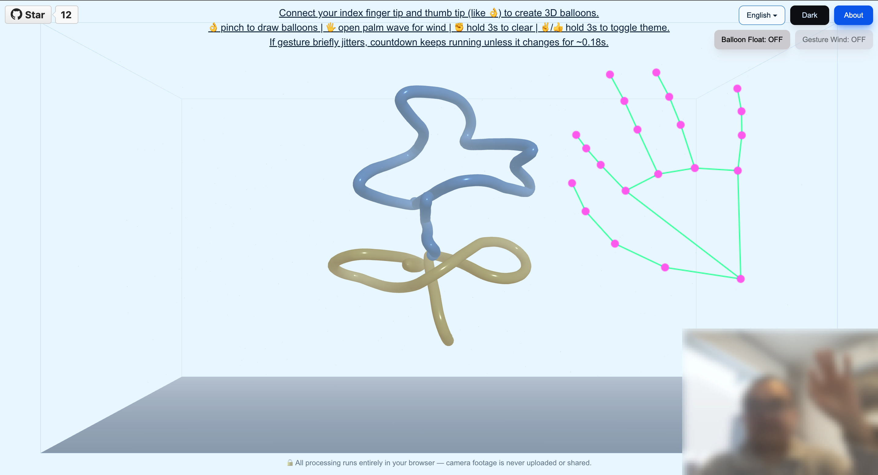 - Gesture wind — open-palm motion creates a directional breeze that nudges balloons