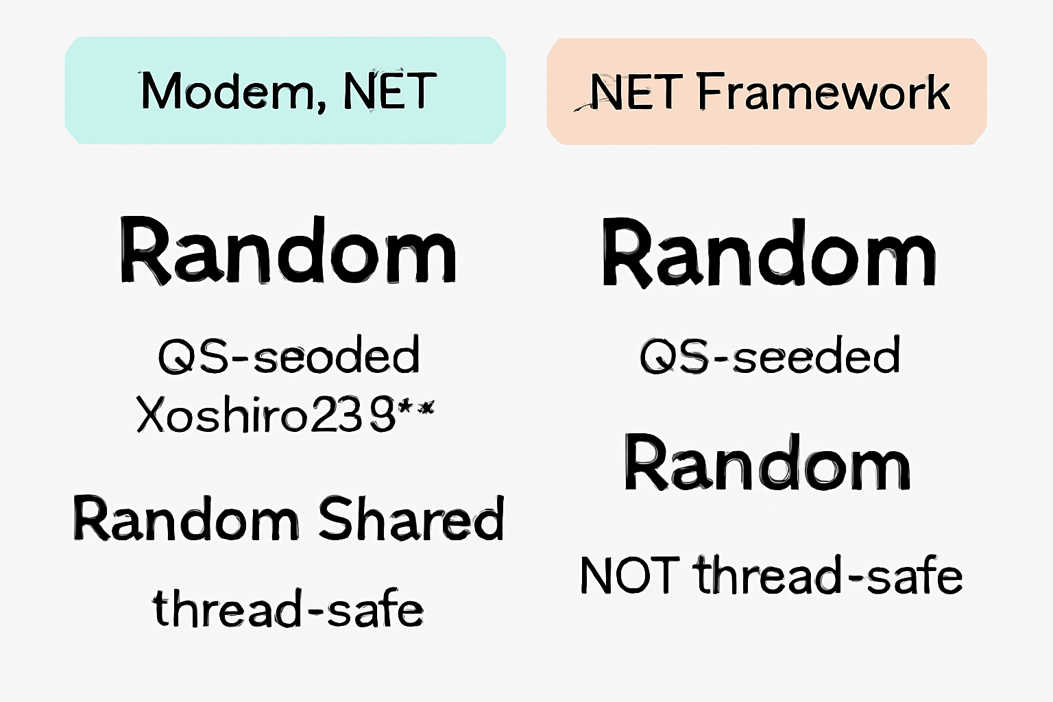 - 在现代 .NET 中,Random 的默认实现使用 Xoshiro256** 算法(XoshiroImpl),其种子通过操作系统提供的非加密随机源获取(Interop.Sys.SystemNative_GetNonCryptographicallySecureRandomBytes)。这意味着在现代运行时里,紧密循环 new Random 不会再因时钟分辨率导致相同结果。