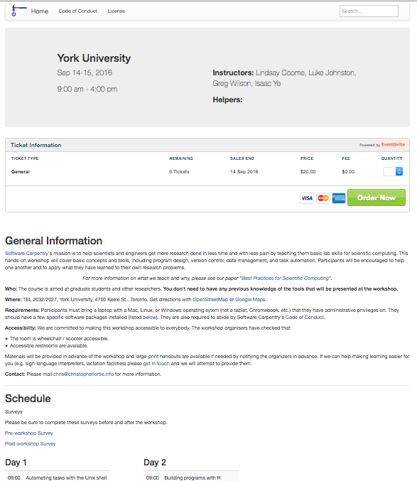 A few minutes later, you can go to the GitHub Pages URL for your workshop site and preview it. In the example above, this is https://gvwilson.github.io/2016-12-01-oomza