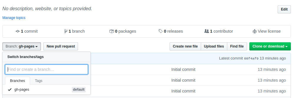 Ensure you are on the gh-pages branch by clicking on the branch under the drop down in the menu bar (see the note below):