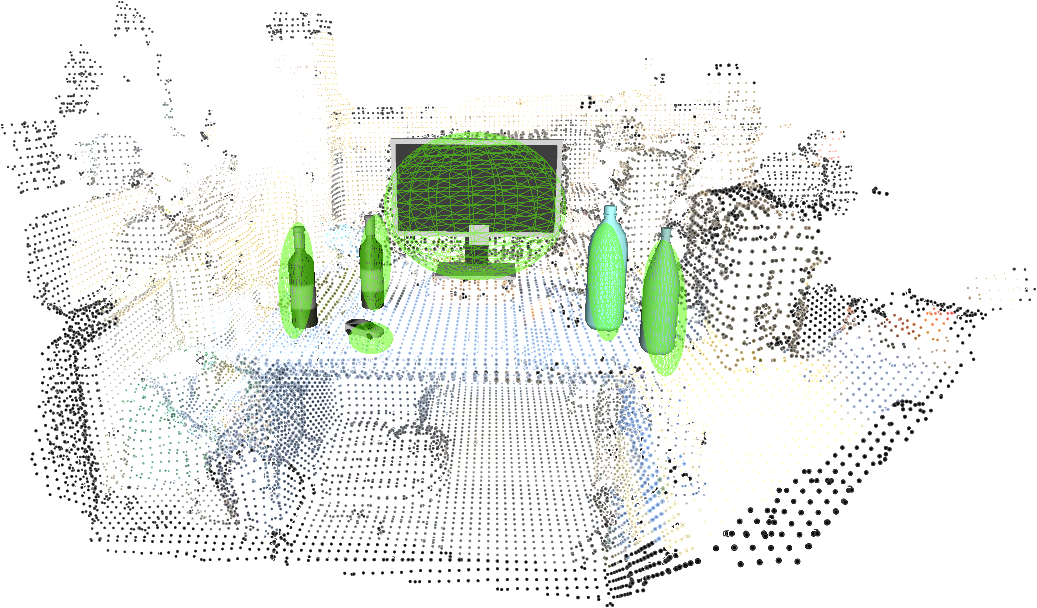 The dataset consists of eight images representing a scene in which six objects are visible. Objects are labelled with 2D bounding boxes. Data association is implicitly defined in the data structures, e.g., each column of the visibility matrix corresponds to one object. Camera parameters are provided, both the intrinsics and the extrinsics for each camera pose. The dataset provides Ground Truth ellipsoids for the objects, which can be used to assess the accuracy of the estimated ellipsoids.