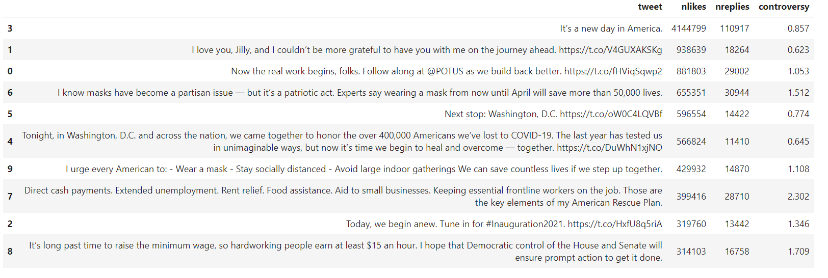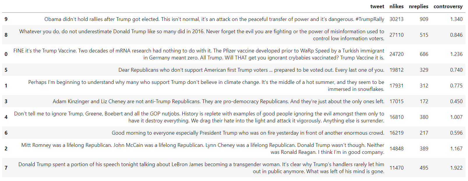 A jupyter notebook that can scrape data from Twitter to display tweets by topic and/or by minimum number of likes along with a controversy rating (calculated as num_replies/num_likes since controversial tweets get more replies).