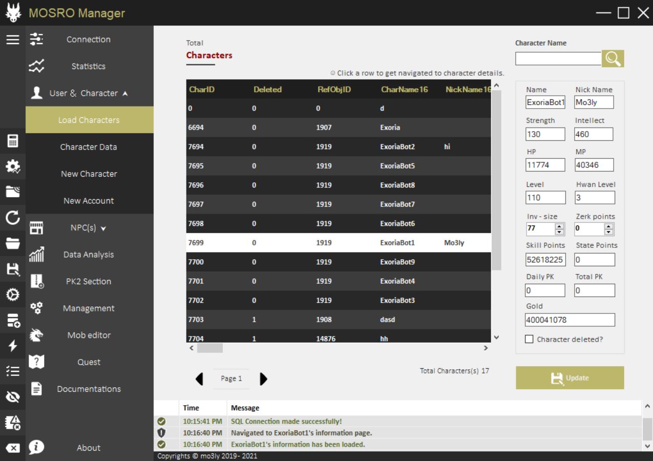Welcome to the MOSRO Manager repository! This tool is designed to simplify your Silkroad server development process. Built with a host of features that range from character management to SQL procedures, this tool is perfect for beginners looking for a more manageable development environment. Although this tool makes things easier, it's crucial to understand how things work behind the scenes for a well-rounded development experience.