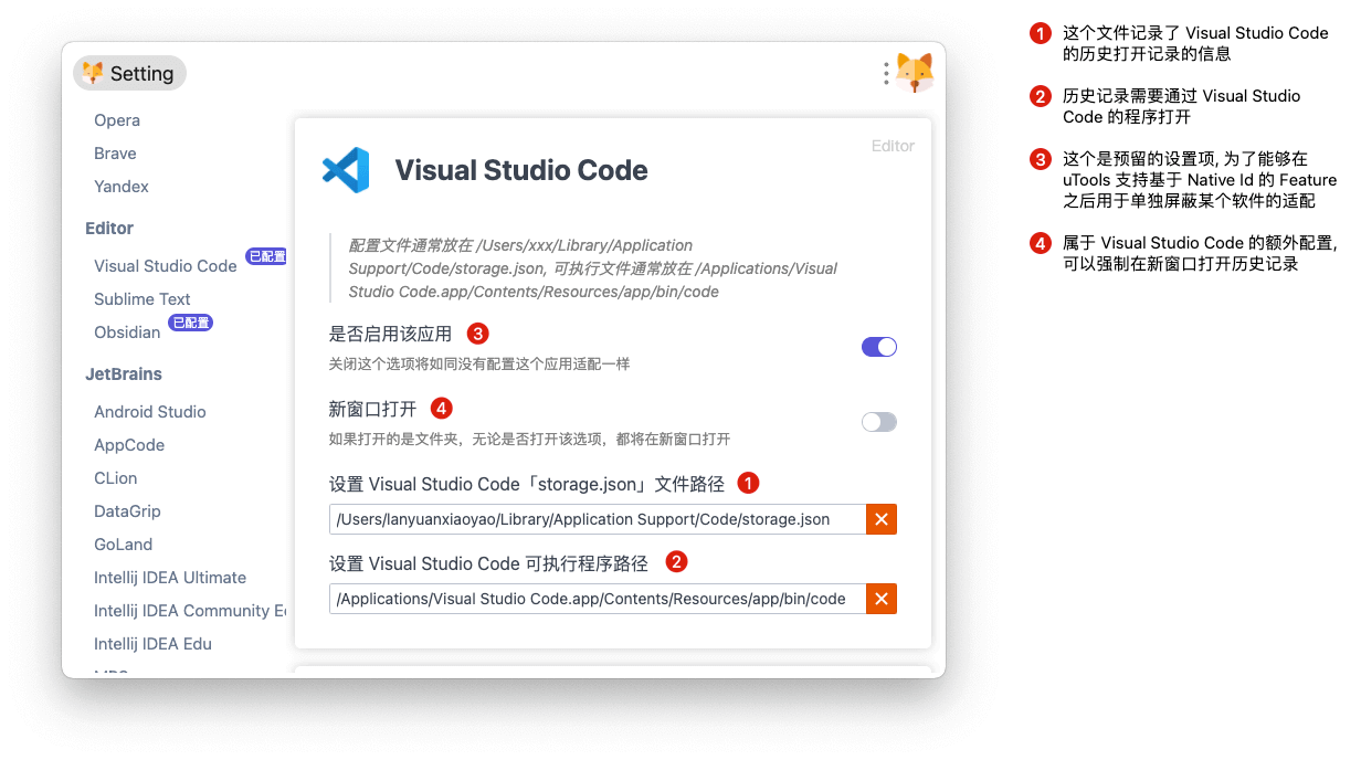 已 Visual Studio Code 为例,需要配置配置文件所在路径和可执行程序所在路径,插件会解析配置文件获得历史记录,并通过可执行文件打开历史记录。