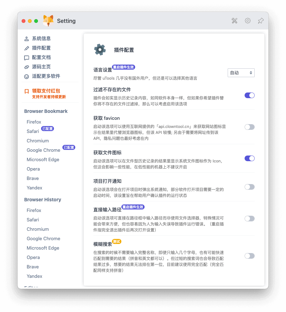 插件支持使用关键字在加载出来的书签记录和历史记录中进行搜索,方便查找打开,同时,关键字支持拼音全拼匹配。