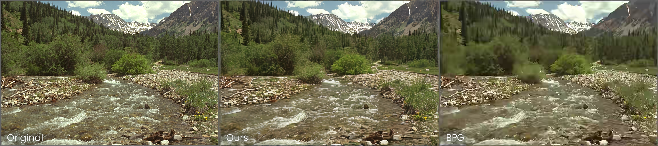 The Kodak Dataset is used as a standard test suite for compression testing. We were able to achieve around a 104:1 compression ratio which is approximately 0.23 bpp. The results will be shown in a triplet format consisting of the original image, our result, and a BPG compressed image at the same bpp.