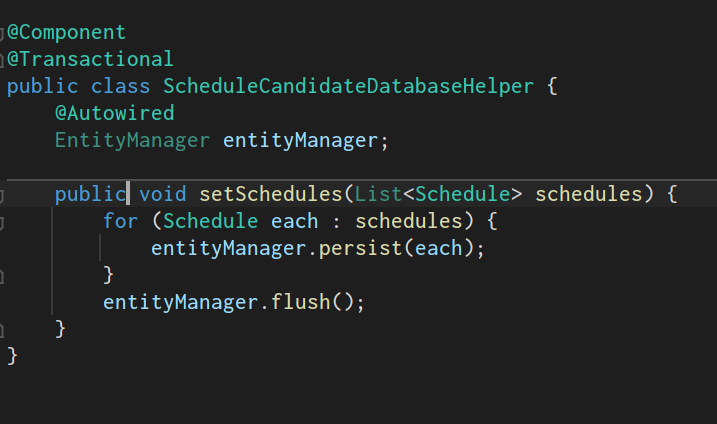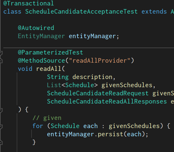 EntityManager는@Transactional어노테이션이 필요합니다.만약 테스트에서 직접 사용한다면 아래와 같이 작성될 것입니다.