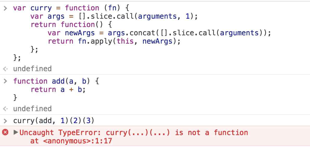 从结果来看,大致完成了我们的预想,可以通过curry()()这样的方法去处理第一次未传完的参数,但是这是远远不够的,我们尝试下面这种用法时,发现报错了!