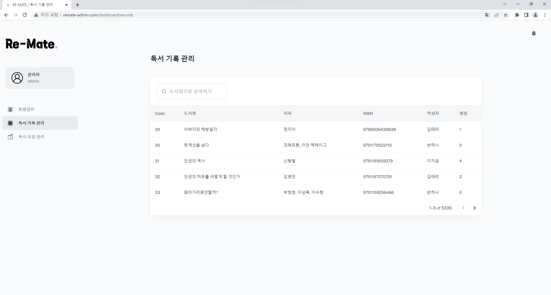 📝RE-MATE Admin 서비스 Re-Mate Admin 페이지는 Re-Mate의 회원, 독서기록, 독서모임을 관리할 수 있는 관리자용 서비스입니다. 👉 Re-Mate API 서버 살펴보기 ✨주요 기능 회원 조회 독서기록 조회 독서모임 조회 🎆프로젝트 목표 API 서버와 React 서버 연동 AWS를 활용한 React 서버 배포 및 DNS 연결 ✍️아키텍처 📰주요 실행 화면 실행 화면에서 제시된 데이터는 모두 더미 데이터로, 실제 유저의 데이터가 아님을 말씀드립니다. ✅ 브랜치 전략 Github Flow 전략 활용 이미지 출처 작업 의도를 명확히 파악할 수 있도록, 브랜치의 프리픽스 (feat, fix 등)를 명확히 적도록 함 명확한 commit 메세지와 주기적인 push를 통한 작업 공유