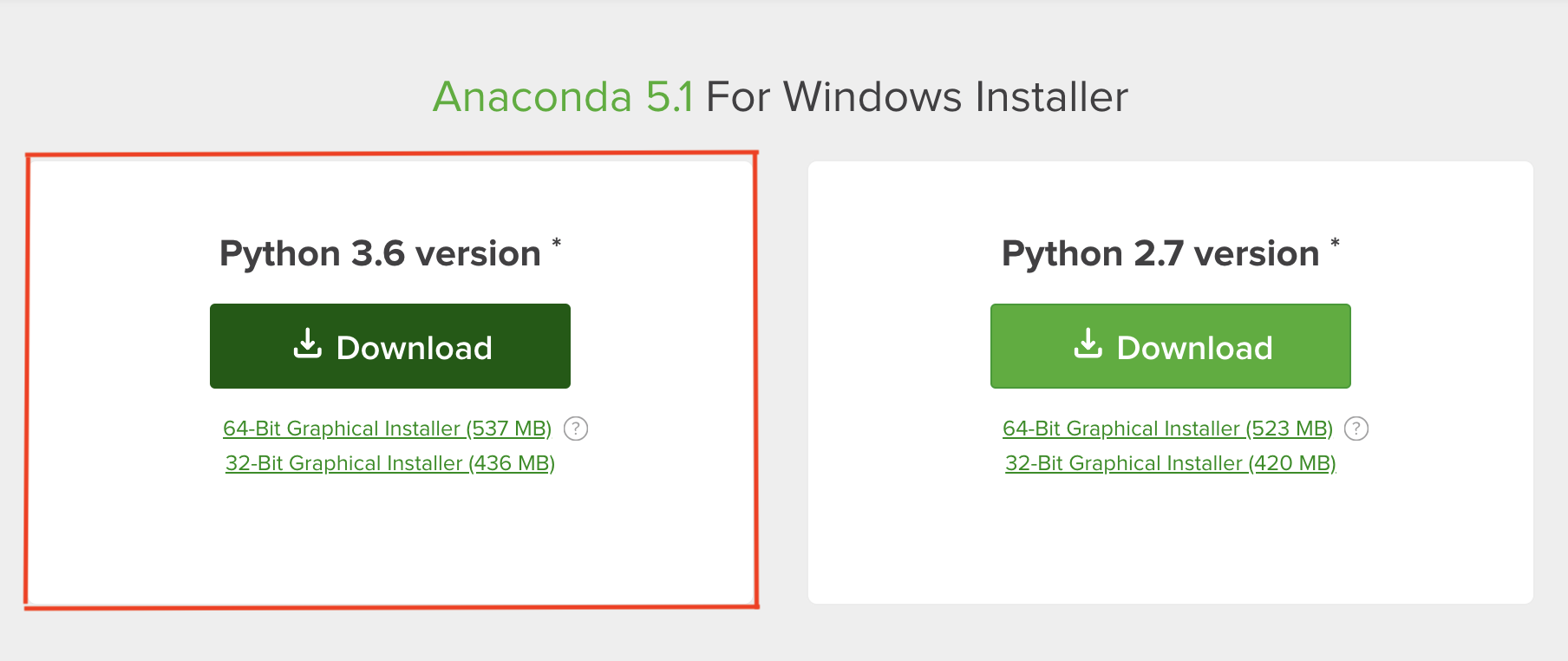 - Visit the Anaconda downloads page on the web: https://www.anaconda.com/download/. Locate the Windows symbol on the screen (the window); click on this Windows link to get to Anaconda 5.2 For Windows Graphical Installer.