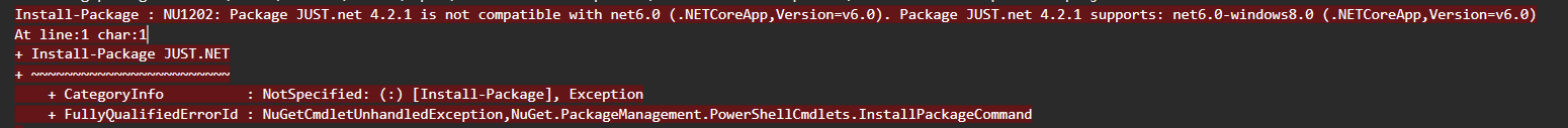 When installing through CLI or through VisualStudio nuget package manager you get the same error when installing the latest version of this package =>  It seems as though the package targets windows 8 instead of .net6 standalone