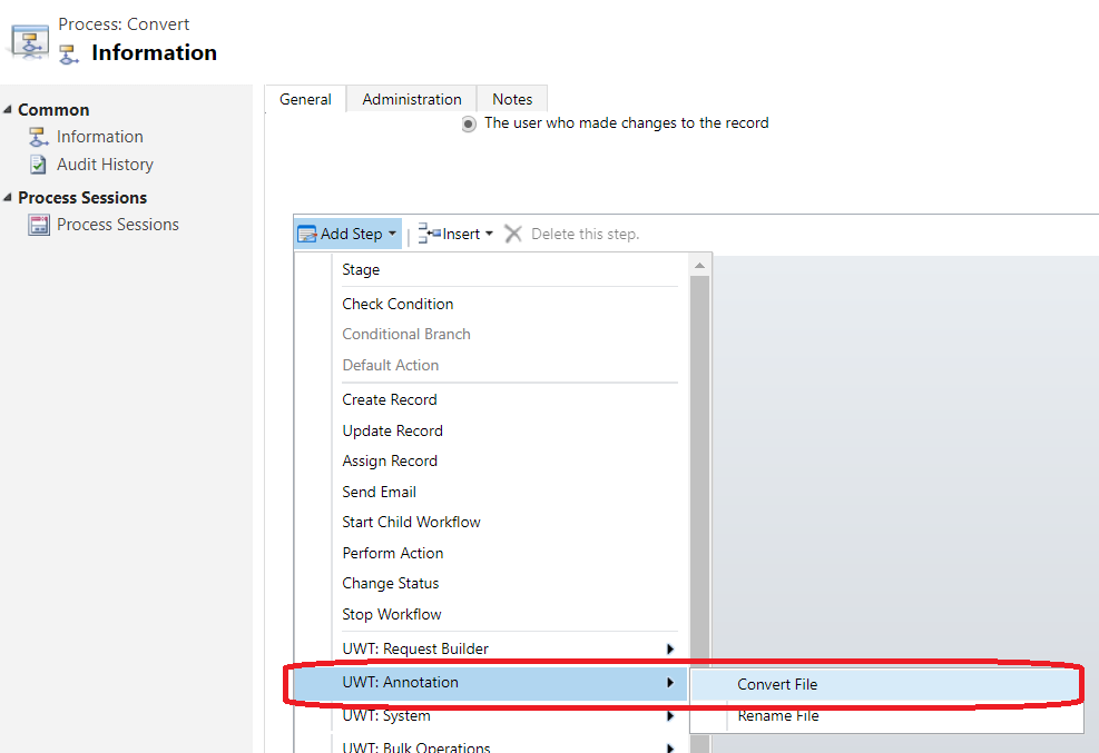 To use "Convert File" step open open Workflow/Action where you plan to use it and add "UWT: Annotation: Convert File" action:
