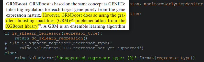 pySCENIC(0.11.2), the default boosting library is changed toGradientBoostingRegressorfromsklearnpackage and the XGB regressor has not yet been supported as the comments say in the codes ofarboreto. I am confused about the consideration not to implement XGBoost in pySCENIC for its maybe better performance in speed than GradientBoostingRegressor.Beta Was this translation helpful? Give feedback.
