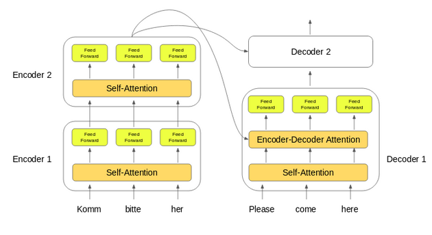 The word embeddings of the input sequence are passed to the first encoder. These are then transformed and propagated to the next encoder. The output from the last encoder in the encoder-stack is passed to all the decoders in the decoder-stack as shown in the figure below: