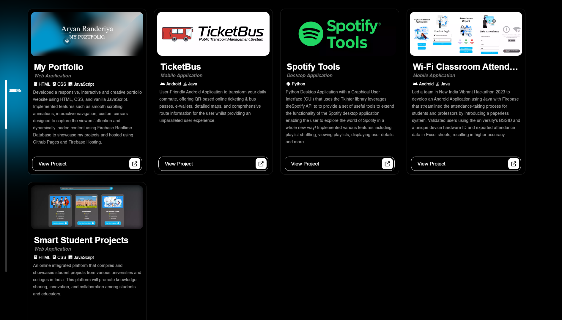 Used HTML, CSS, vanilla Javascript and Firebase as Realtime Database, Cloud Storage & Web hosting. (Although i don't really use firebase for loading my projects anymore, i just use plain json) Utilised various libraries such as Greensock animation platform (GSAP) and Tailwind.