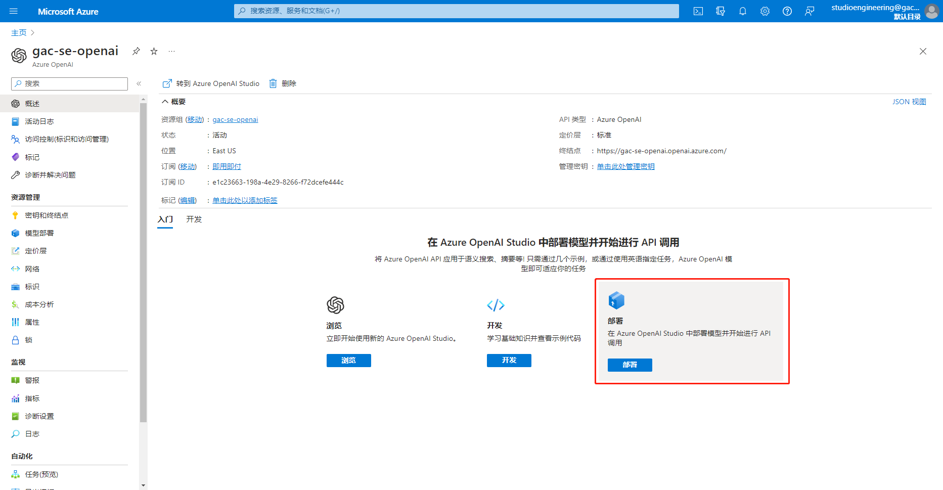 之后,就可以去部署模型了,点击“部署”即可,会跳转到 Azure OpenAI Stuido 进行下面的操作: