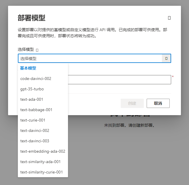 进入 Azure OpenAi Studio 后,点击新建部署,会弹出如下对话框:
