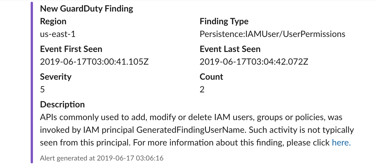 To check that everything is working properly, navigate to https://us-east-1.console.aws.amazon.com/guardduty/home?region=us-east-1#/settings (make sure us-east-1 is the region you deployed to) and click on Generate Sample Findings. This will generate all the types of findings GuardDuty supports and send them to Slack in about ~5 minutes.