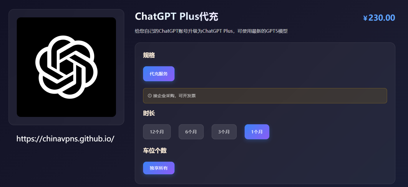 三、给你自己的ChatGPT账号代充值:如果你已经拥有ChatGPT账号,并且希望继续使用自己账号里的对话记录、模型偏好、收藏内容以及个性化设置,那么可以选择为你现有的ChatGPT账号代充值,每月仅需174元,非常适合长期使用ChatGPT Plus,并且习惯保留自己账号数据的老用户。