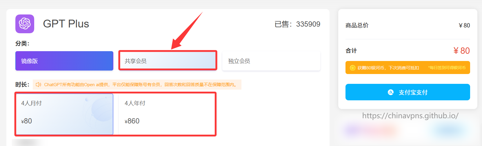 “共享会员”是银河录像局推出的ChatGPT Plus原生账号合租服务,用户可以使用ChatGPT Plus会员的所有功能和服务,而且价格也比较便宜,最低每月76元。不过,“共享会员”服务也有使用次数限制,也仅适合ChatGPT轻度用户使用。