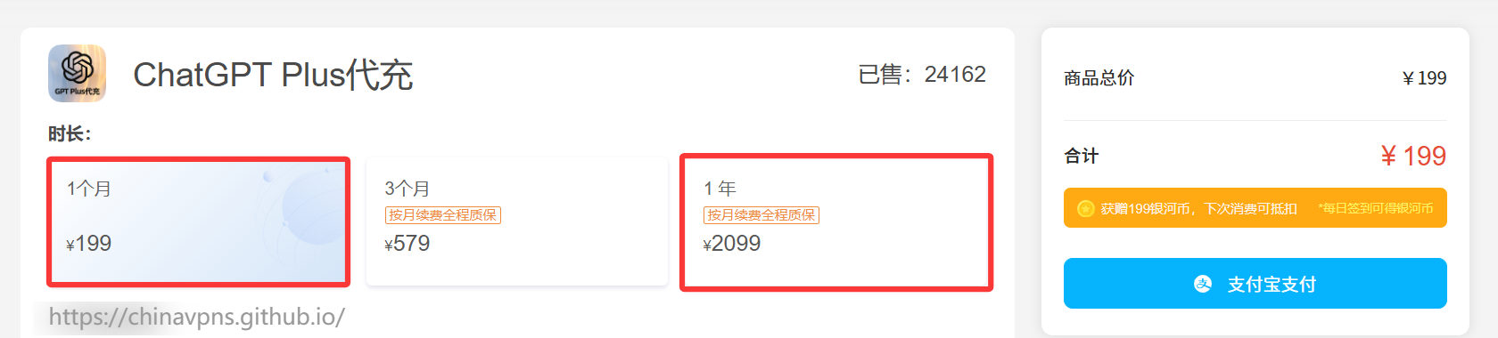 如果你是ChatGPT的老用户,并且希望继续使用自己原来的ChatGPT账号,也可以选择银河录像局提供的“ChatGPT Plus代充”服务。现在参与平台活动的话,ChatGPT Plus代充值的“1个月”套餐仅需189元,“1年”套餐价格低至174元/月。
