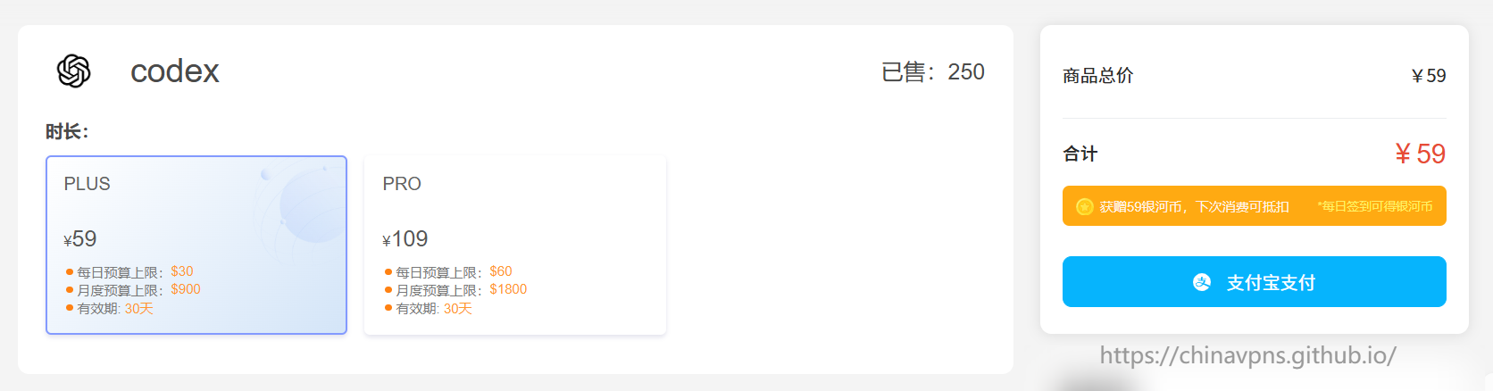 如果你是专业开发人员,也可以选择Codex拼车服务。其中,Codex拼车Plus版为59元/月,Codex拼车Pro版为109元/月,价格实惠、性价比高,非常适合个人开发者和团队长期使用。