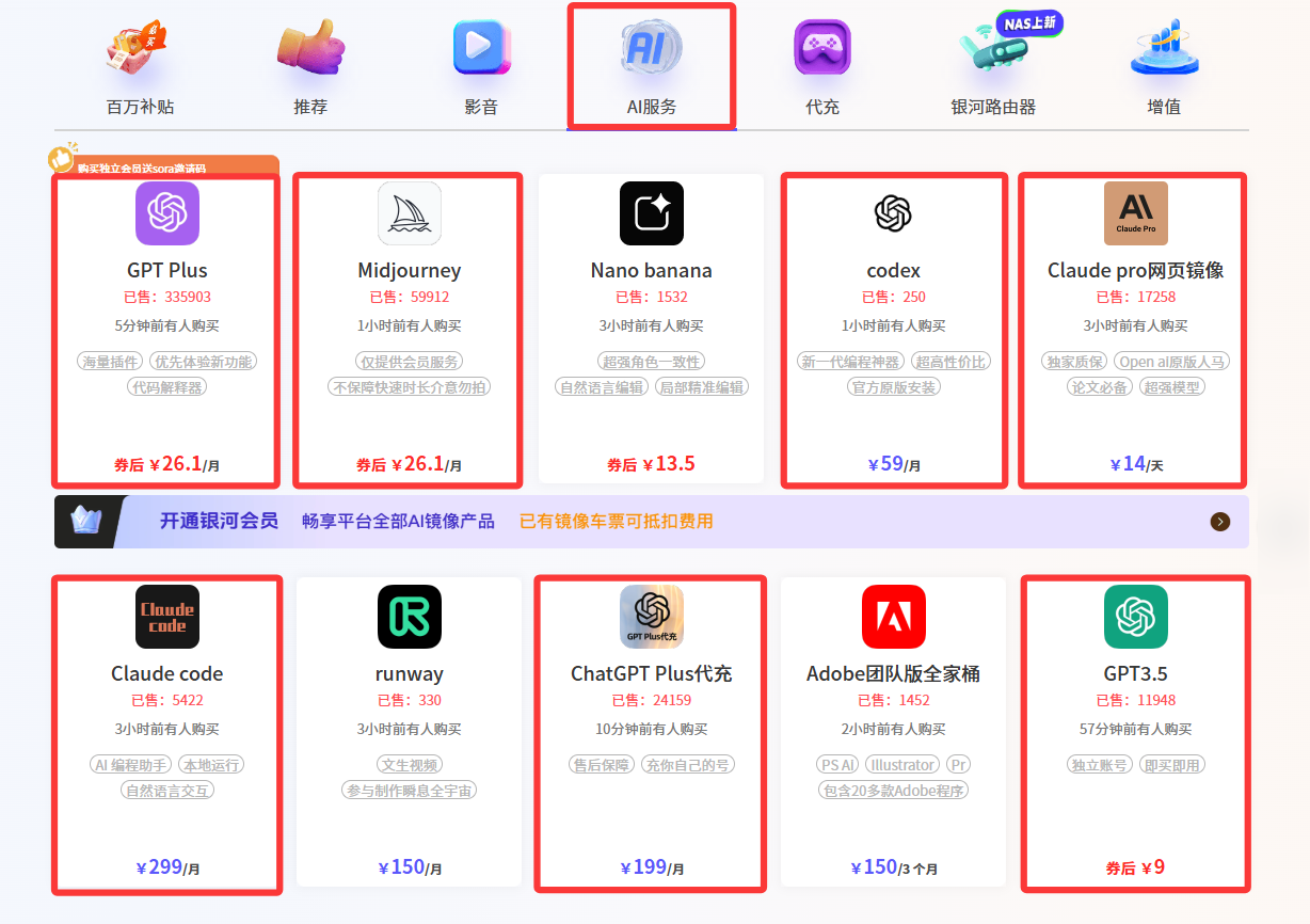 银河录像局还提供Claude Pro网页镜像(14元起)、Claude Code拼车、Midjourney合租(27元/月)等服务。