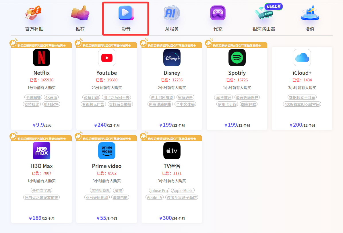 银河录像局还提供Netflix、Disney、HBO Max、Prime Video、YouTube、Spotify、iCloud+等流媒体账号合租服务。