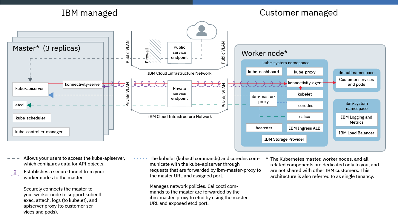 AKS,IKS, provide a public Cluster Endpoint, e.g.https://35.41.67.241:443to expose the Control Plane to the public Internet, used bykubectlfrom users, and a private Cluster Endpoint, e.g.https://10.10.100.12:6443to expose the Control Plane in the private network where worker nodes are placed.The Konnectivity-server Endpoint, port