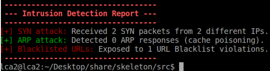A simple intrusion detection program written in C. It uses packet sniffing to analyze data packets and detects potential SYN flood and ARP spoofing attacks as well any blacklisted URLs.
