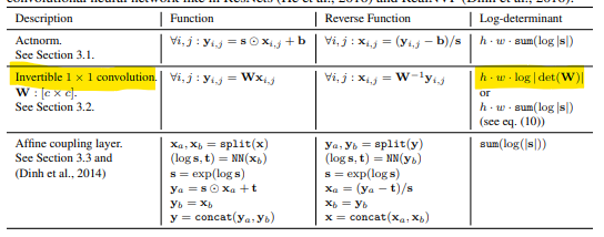 In the following Table 1 [Glow paper], we can see the log-determinant (logdet) of the invertible 1x1 convolution (highlighted in yellow).