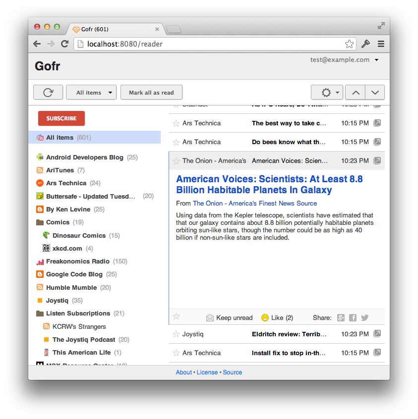 When running in production, Gofr routinely (every 10 minutes, configurable in cron.yaml) runs a cron job to update feeds. Since the development server does not support cron jobs, the feeds will need to be updated manually by logging in to the application as an Administrator, and opening the cron job URL in a web browser: http://localhost:8080/cron/updateFeeds.