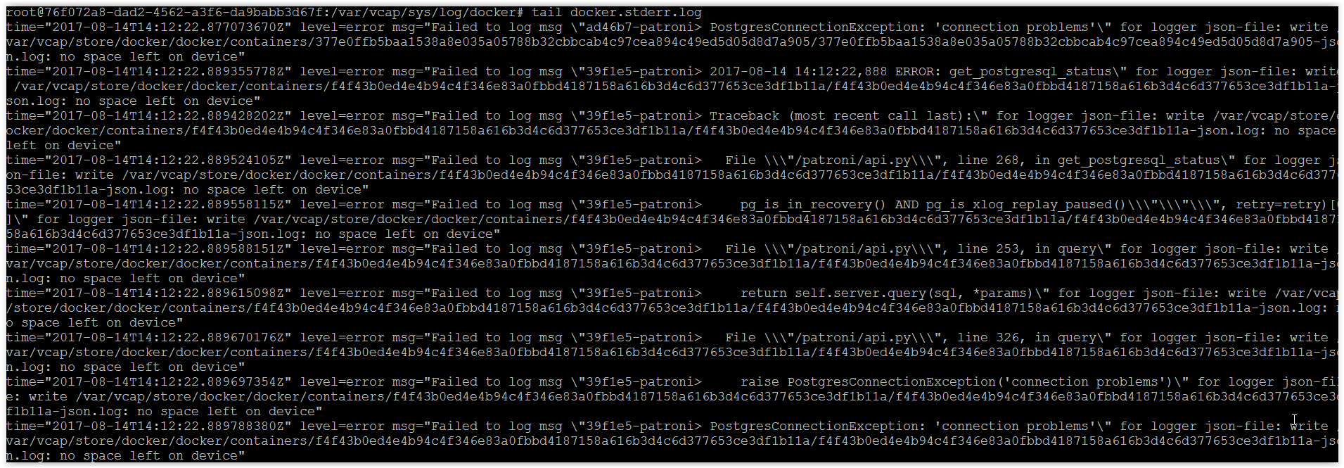 After checking the logs for cell vm we found that the store is getting full giving no space left error