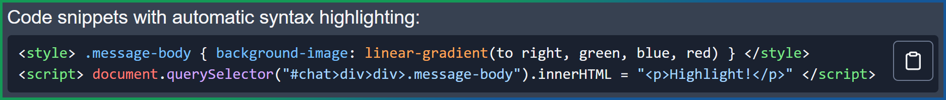 An extension that adds syntax highlighting to code snippets, along with a toggleable copy-to-clipboard button and a performance mode for minimal impact on CPU usage.