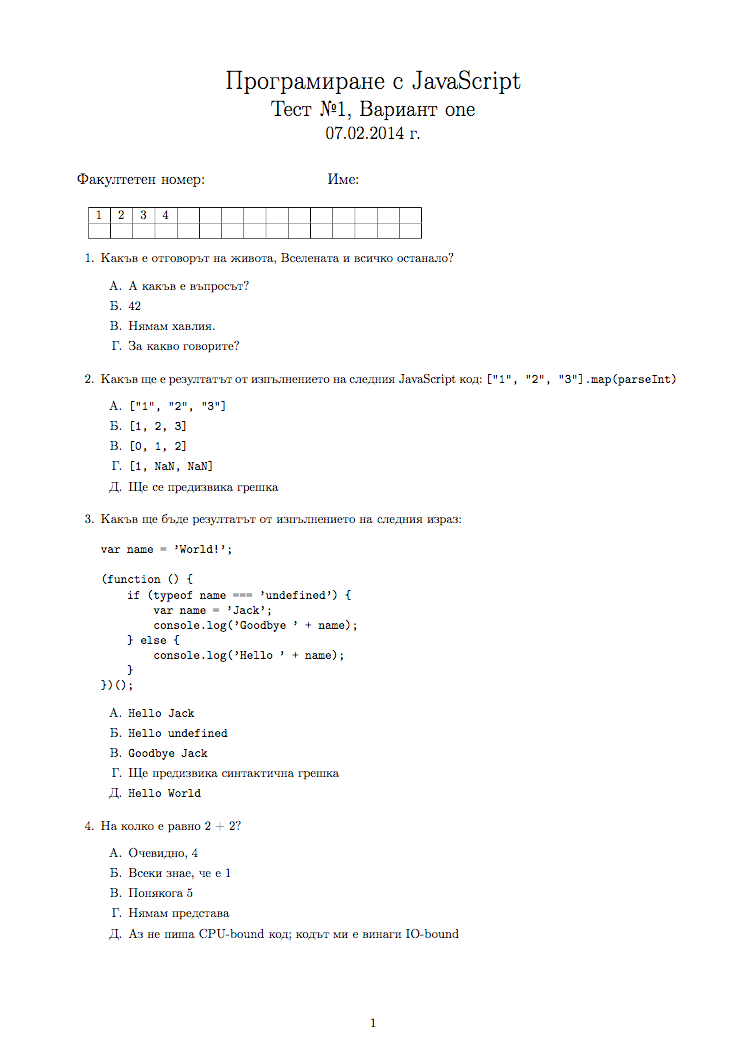 варианти (пермутации) на тестовите въпроси, както и съответен PDF с отговори.