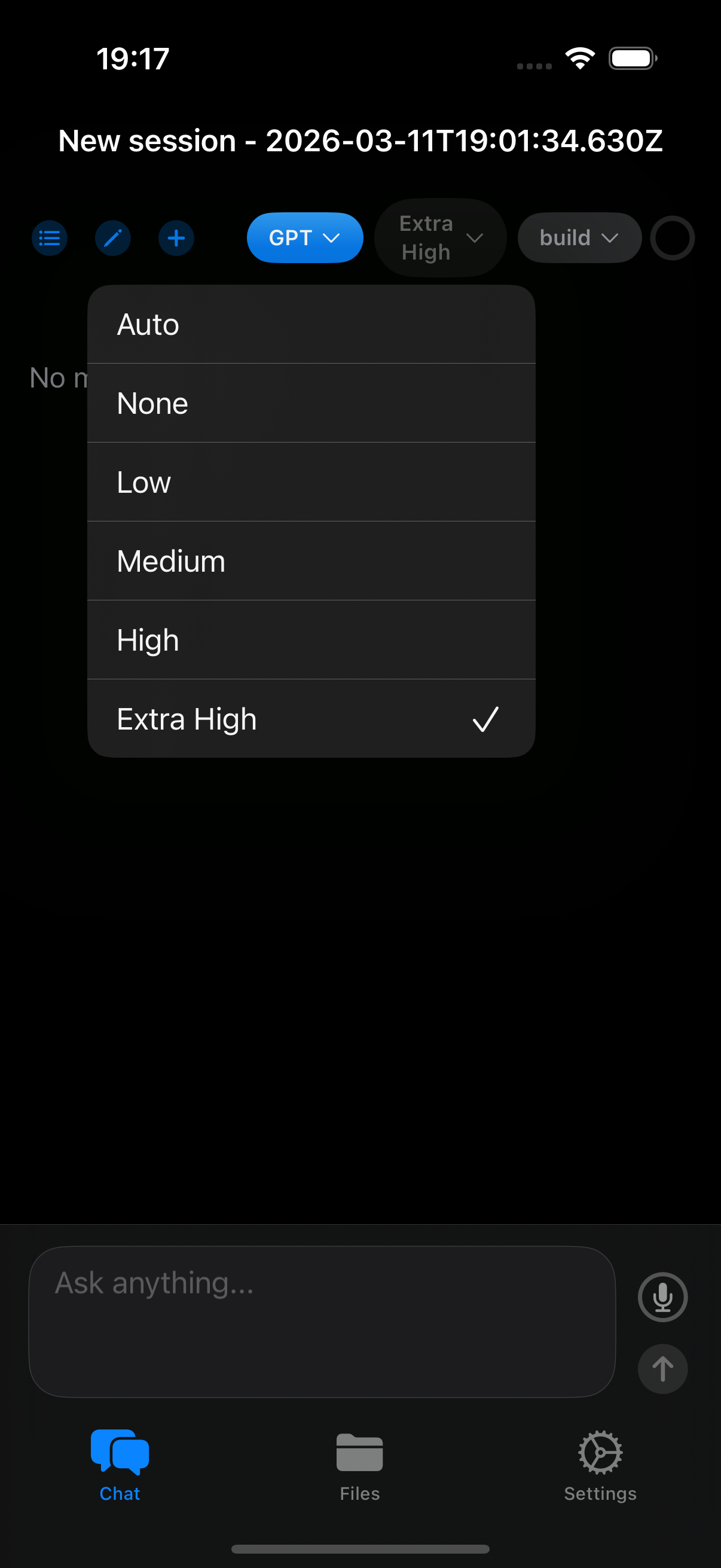 The server already exposes model-specific effort/variant capabilities, but the iOS client only allowed model selection. This change keeps the UI driven by server config instead of hardcoding per-model options, so the same client works with providers that expose different variant sets.