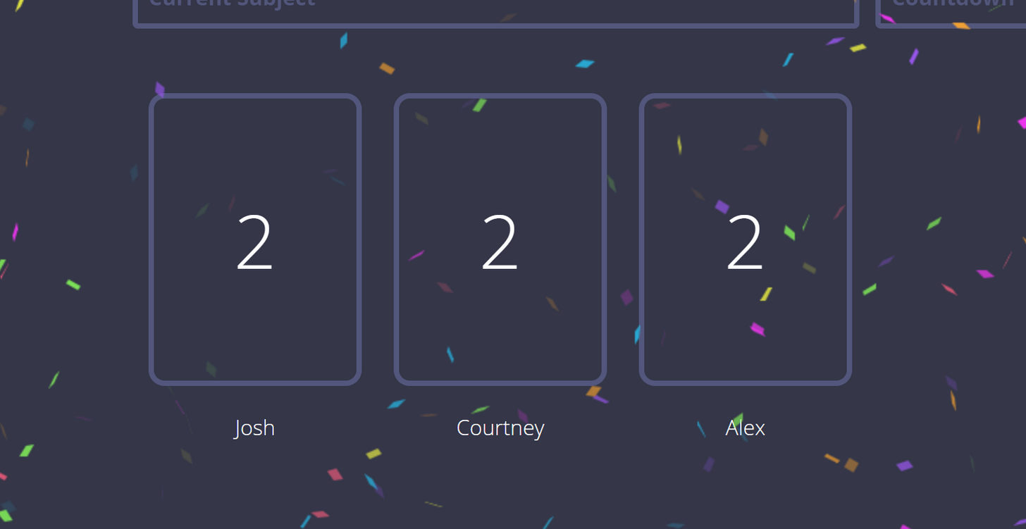 If everybody happens to have the same vote, you'll be greeted with some celebratory confetti for the concensus courtesy of confetti-js. One danger with this is that people like it so much it can start to encourage groupthink.