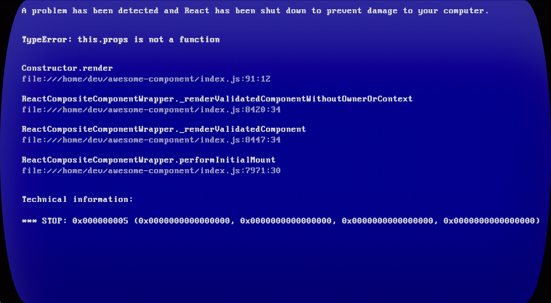 react-bsod (aka blue screen of death) renders an error in this old-school format: